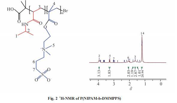 對P(NIPAM-b-DMMPPS)進(jìn)行核磁表征,結(jié)果如Fig.2所示。δ1.19處的1峰屬于CCH3;δ3.97處的2峰屬于一CH2一。同樣,P(NIPAM-b-DMMPPS)中譜圖中也有對應(yīng)于PDMMPPS的特征峰:δ3.60~3.67,δ3.11,δ2.17,δ2.95處的峰分別代表PDMMPPS中一N+一CH2一,一N+一(CH3)2,一CH2一和一CH2一SO3一上的氫質(zhì)子峰。核磁結(jié)果表明了嵌段聚合物P(NIPAM-b-DMMPPS)的成功合成。