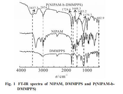 對單體NIPAM,DMMPPS及共聚物P(NIPAM-b-DMMPPS)進(jìn)行紅外表征,結(jié)果如Fig.1所示。通過對比分析可以看出,P(NIPAM-b-DMMPPS)紅外譜圖中,3437cm-1為PNIPAM鏈段酰胺基中仲胺N-H的伸縮振動吸收峰,2974cm-1為飽和C-H伸縮振動吸收峰,1724cm-是PNIPAM鏈段中羰羰基C=O的伸縮振動吸收峰,1648cm-1的吸收峰為O-C=O的伸縮振動峰,1483cm-1為飽和一CH2一的伸縮振動峰,1179cm-1是PDMMPPS鏈段中S=O鍵的吸收峰,603 cm-1為C一Br的振動峰。紅外光譜結(jié)果分析表明,此共聚物由單體NIPAM,DMMPPS合成為預(yù)期的目標(biāo)產(chǎn)物。