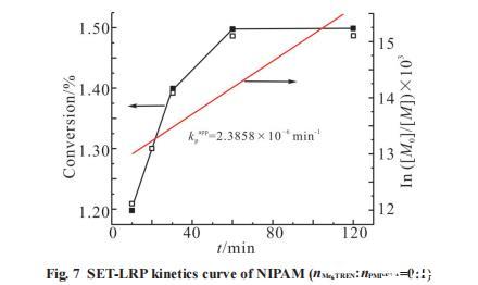 從Fig.7可以看出,這組與配體比例當(dāng)nMe TREN:nPMDETA 6 =1:4類似,轉(zhuǎn)化率極低,實驗現(xiàn)象也相同,說明在Me。TREN占比低于PMDETA時,混合配體的催化效率會明顯下降甚至不能催化聚合。
