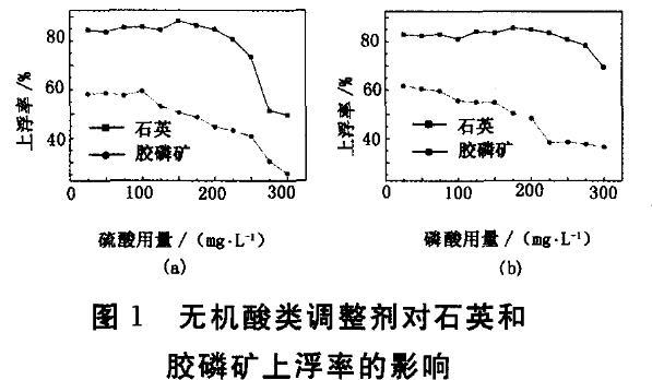 硫酸和磷酸是較為有效的膠磷礦抑制劑,工業(yè)應(yīng)用廣泛??疾靷鹘y(tǒng)調(diào)整劑對石英和膠磷礦可浮性的影響,結(jié)果見圖1。