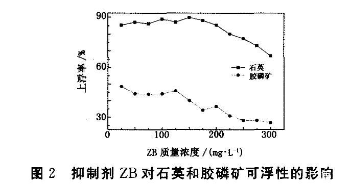 從圖2看出,ZB對膠磷礦和石英的抑制效果明顯,當(dāng)ZB用量為150 mg/L時,兩者上浮率差異達到最佳,為54.90個百分點。與圖1對比可知,使用ZB做調(diào)整劑時,可在用量較低時得到更好的抑制效果。并對添加ZB后的礦漿pH值進行測定,當(dāng)ZB用量達到150 mg/L時,礦漿pH為1.2左右;當(dāng)ZB用量超過200 mg/L時,石英上浮率仍保持在70%以上,說明使用ZB不會造成石英上浮率明顯下降,更有利于膠磷礦和石英的有效分離。