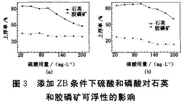此外使用ZB和硫酸及ZB和磷酸組合的復(fù)配藥劑作為調(diào)整劑進行試驗,控制ZB用量為150 mg/L,分別考察添加不同用量的硫酸和磷酸對石英和膠磷礦可浮性的影響,結(jié)果見圖3。