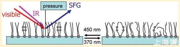 在此,我們研究了光開關(guān)脂質(zhì)DT Azo-5P(圖1)的單層,其為純的,并與脂質(zhì)1,2-二棕櫚酰-sn-甘油-3-磷酸膽堿(DPPC)混合。如圖1中的UV/vis光譜所示,光活性脂質(zhì)可分別用370和450 nm的光從其反式狀態(tài)切換到順式狀態(tài)并返回。我們將表面壓力測量與無標(biāo)簽、寬帶振動和頻率產(chǎn)生(VSFG)光譜相結(jié)合。10這些技術(shù)使我們能夠研究空氣-水界面上的脂質(zhì)分子單層。可以獲得有關(guān)脂質(zhì)與水分子相互作用的信息以及脂質(zhì)的分子結(jié)構(gòu)。在非線性光學(xué)技術(shù)VSFG中,紅外(IR)光束和可見光(VIS)光束在界面處組合,產(chǎn)生具有兩個入射光束和頻率的信號。如果紅外線與分子振動共振,信號就會強烈增強。已經(jīng)證明,這種通過分子振動的技術(shù)提供了有關(guān)脂質(zhì)分子構(gòu)象和取向的信息。11-18在中心對稱介質(zhì)中禁止和頻產(chǎn)生,因為這是一種二階非線性光學(xué)過程。19因此,該技術(shù)對中心對稱材料(如水表面)的最外表面分子層敏感。相反,缺少信號表明界面上的材料或分子群是中心對稱的。對于金表面偶氮苯功能化自組裝單分子膜,SFG在測定光異構(gòu)化的截面和機理方面非常有用。得出的結(jié)論是,光異構(gòu)化是由直接電子激發(fā)驅(qū)動的,類似于液相中的偶氮苯