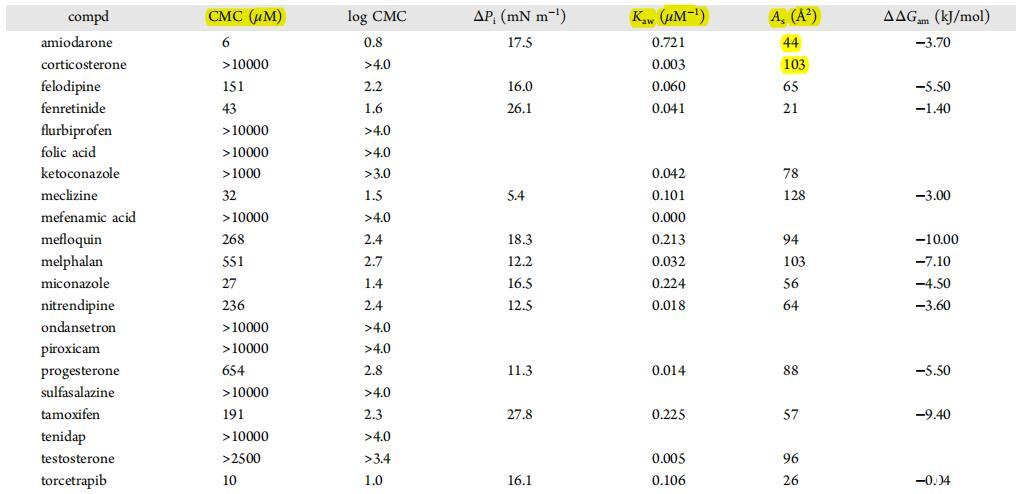 表面活性測定?;衔镌贒MSO中連續(xù)稀釋超過12種不同濃度,并在pH值為6.5的0.05 M磷酸鹽緩沖液中添加至最終10%的DMSO含量。最終化合物濃度默認(rèn)范圍為10 nM至10 mM。在第二次實(shí)驗中,對于達(dá)到溶解度極限或需要對相關(guān)濃度范圍進(jìn)行解析以確定最佳參數(shù)的情況,定義了替代濃度范圍。樣品靜置10分鐘,以便在液體中平衡?空中接口。表面壓力分布在張力計(MultiPi WS1,Kibron Inc.,芬蘭赫爾辛基)上進(jìn)行,通過之前的測量(72.8 mN/m)對50μL等份樣品進(jìn)行校準(zhǔn)。通過對生成的等溫線進(jìn)行曲線擬合確定表面活性參數(shù),并根據(jù)經(jīng)典的空氣吉布斯熱力學(xué)理論進(jìn)行計算?水里,臉上。主要導(dǎo)出參數(shù)如下。(i)考:空氣?水分配系數(shù),來自等式2