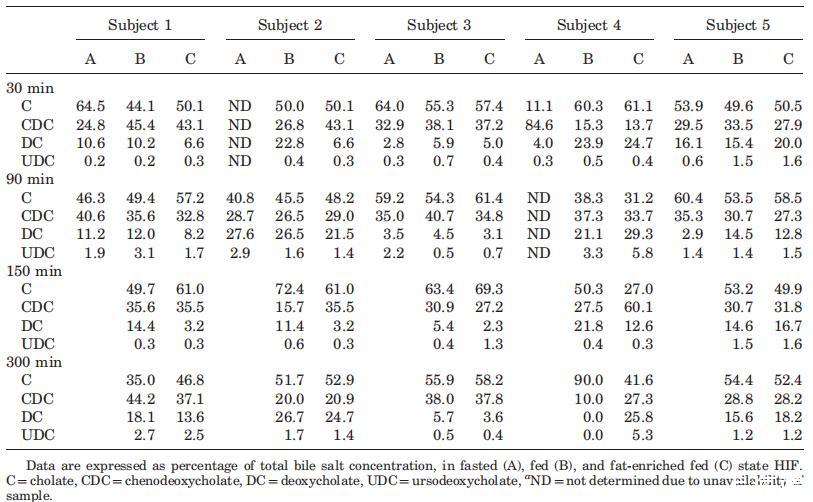 盡管在較低程度上,當(dāng)檢查受試者的膽汁鹽池成分時,也觀察到了一種可變模式(表3)。膽酸鹽和鵝去氧膽酸鹽(結(jié)合膽汁鹽和未結(jié)合膽汁鹽之和)至少占總膽汁鹽庫的65%,脫氧膽酸鹽和熊去氧膽酸鹽(結(jié)合膽汁鹽和未結(jié)合膽汁鹽之和)雖然含量較少,但在每個樣本中都發(fā)現(xiàn)。文獻報道了禁食狀態(tài)HIF膽汁鹽池成分的主體間變異性。2,24在這些研究中,變異性主要是由于膽鹽與甘氨酸或牛磺酸結(jié)合,因為未結(jié)合的膽鹽僅占總膽鹽庫的不到3%。研究發(fā)現(xiàn),隨著時間的推移,個體內(nèi)膽汁鹽組成以及營養(yǎng)狀態(tài)之間的一致性相對較高,很少排除異常值(表3)。例如,對于S3和S5,在三種營養(yǎng)狀態(tài)下,在整個取樣時間內(nèi),相對膽鹽組成相當(dāng)一致,而對于S4,膽酸的分?jǐn)?shù)在38%和90%之間變化(表2)。