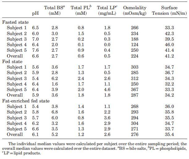 當(dāng)考慮五個不同的受試者時,總膽汁鹽濃度隨時間的變化在所有三種營養(yǎng)狀態(tài)下都呈現(xiàn)波動模式(圖3)。無法定義可應(yīng)用于每個單獨圖表的清晰的濃度-時間曲線。文獻中也報道了喂食條件下膽汁鹽濃度的高度變化。可以找到高達37 mM27和低至0.5 mM33的值;然而,文獻中觀察到的典型膽鹽濃度約為10mm,在進食后30–60分鐘檢測到。11,12,19,33在本研究中,攝入Sure Plus1后30分鐘,膽汁鹽濃度中值為8.3 mM;在高脂肪喂養(yǎng)狀態(tài)下,30分鐘后獲得的中值為11.9 mM。這些中值與文獻中觀察到的典型值一致。相比之下,五名登記受試者的單獨匯集腸道樣本顯示,在兩種喂養(yǎng)狀態(tài)下,總膽汁鹽濃度均低于5.3 mM。同樣在禁食狀態(tài)下,當(dāng)不存在膽囊收縮刺激時,可以看到高度可變和時間依賴性的膽鹽濃度:濃度范圍為0.3至9.6 mM(圖3)。Lindahl等人的一項研究也描述了類似的高變異性。34作者報告了24名志愿者的禁食狀態(tài)膽鹽濃度,范圍在0.1至13.3 mM之間,總收集時間為150分鐘。Brouwers等人2和Perez de la Cruz Moreno等人24也報告了禁食狀態(tài)下的膽鹽濃度單個志愿者的小腸,分別為1.0至5.3 mM和0.5至5.5 mM。使用當(dāng)前數(shù)據(jù)集計算的個體膽汁鹽濃度中位數(shù)顯示出較小的受試者間變異性,最小值為2.0 mM,最大值為3.0 mM;總體中值為2.6 mM(表2)。這些中值與禁食狀態(tài)下報告的膽鹽水平相當(dāng)吻合:之前的文章描述了禁食狀態(tài)下總膽鹽濃度在2.0和5.9mm之間。11–13,19與當(dāng)前設(shè)置中采用的120分鐘的總?cè)又芷谙喾?,在后述報告中使用單時間點測定來評估空腹水平。11–13,19