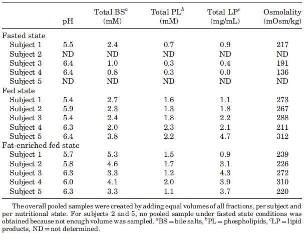 攝入Sure Plus1或Scandishake Mix1后前2小時的滲透壓通常高于禁食狀態(tài)下的HIF,盡管禁食狀態(tài)和兩種喂食狀態(tài)之間未達到顯著差異。禁食狀態(tài)滲透壓值一般為低滲透,或接近等滲透值。224 mOsm/kg的總體中值為低滲透性,與Brouwers等人1和Deferme等人報告的人類十二指腸吸出物的平均滲透壓一致。,38但高于Perez de la Cruz Moreno等人報告的平均值。24在給藥(n?3)后,在混合樣品中獲得的滲透壓較低,與Kalantzi等人11和Gisolfi等人報告的滲透壓較好。39在喂食和富含脂肪的喂食狀態(tài)下均發(fā)現(xiàn)高滲值,尤其是在消化的前3小時。在喂食和富含脂肪的喂食狀態(tài)下,總的中位數(shù)滲透壓為等滲透壓(分別為285和278 mOsm/kg)。進食后180分鐘內(nèi)較高的滲透壓與膽汁鹽濃度、磷脂或脂質(zhì)產(chǎn)物總量無關(guān)。Kalantzi等人19將吸入十二指腸內(nèi)容物的高滲值歸因于雙糖和果糖復(fù)合碳水化合物的存在,以及后者的緩慢吸收。在本研究中未確定總碳水化合物水平,因此,該陳述無法驗證。