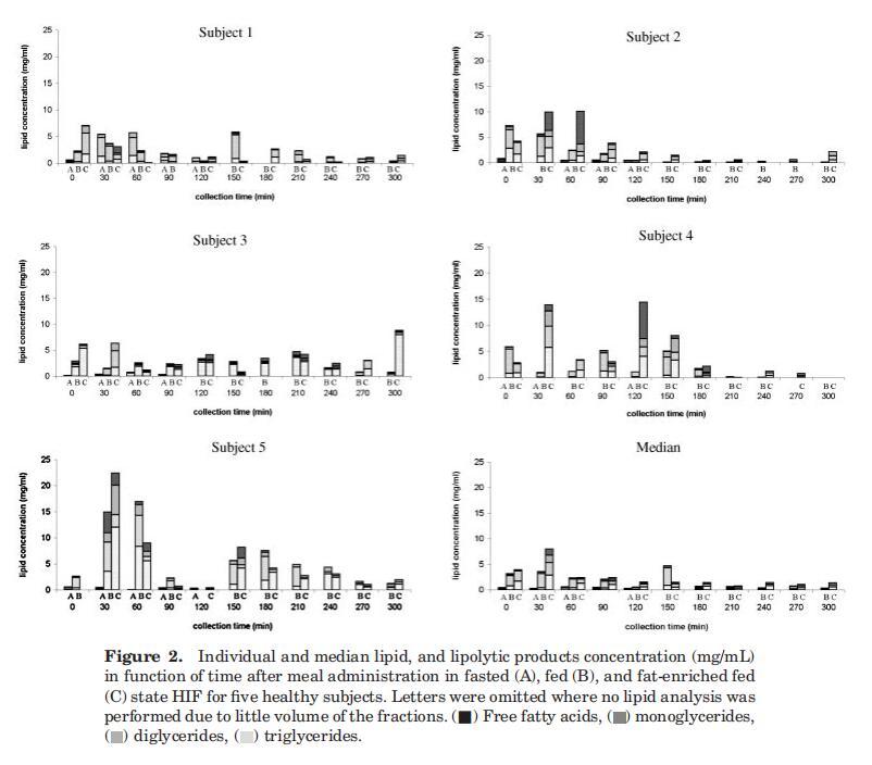 對于四名受試者(S2、S3、S4、S5),在禁食狀態(tài)HIF中發(fā)現(xiàn)微量脂質(zhì)(平均0.4?0.3 mg/mL),這與Armand等人12報告的受試者1十二指腸吸出物中的禁食水平0.6 mg/mL相符,禁食狀態(tài)下的脂質(zhì)濃度等于或高于30-120分鐘期間在喂食和富含脂肪的喂食狀態(tài)下測定的濃度(圖2)。這一觀察的可能原因可能與胃滯留時間和/或小腸上皮細(xì)胞的周轉(zhuǎn)率有關(guān),從而釋放膜脂。在喂食和富含脂肪的喂食狀態(tài)之間,根據(jù)個體特征,沒有發(fā)現(xiàn)實質(zhì)性差異。然而,中位數(shù)曲線顯示,進食30分鐘后,在高脂肪喂養(yǎng)狀態(tài)下,總脂質(zhì)濃度顯著增加。由于沒有觀察到脂質(zhì)產(chǎn)物在管腔內(nèi)出現(xiàn)延遲,因此可以得出結(jié)論,服用液體膳食的脂肪含量的應(yīng)用差異不會改變胃排空。先前已經(jīng)證明,給予恒河猴的碳水化合物、蛋白質(zhì)和脂肪等熱量負(fù)荷產(chǎn)生了相似的胃排空率,這表明胃排空是根據(jù)膳食的熱量密度進行調(diào)節(jié)的,而不管其營養(yǎng)成分如何。32