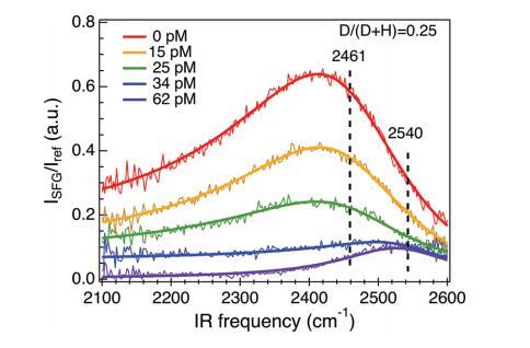 觀察到OD拉伸共振頻率的變化,證明了界面水的結(jié)構(gòu)隨著DNA的吸附而發(fā)生變化。因此,與我們之前的結(jié)論相反,陽離子脂質(zhì)的界面水VSF強度的降低不能完全由表面電位的降低來解釋。48也就是說,添加陽離子脂質(zhì)的DNA后,界面水明顯重組。隨著DNA濃度的增加,HOD譜向更高頻率移動,這表明界面水的平均氫鍵強度降低。例如,在反膠束中所含的欠配位水中,已經(jīng)觀察到平均氫鍵強度弱于水在本體中所經(jīng)歷的氫鍵強度。70,71