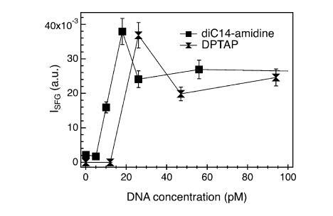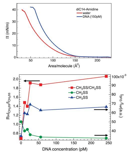 圖7。(上圖)在不存在(紅線)和存在(藍線,150μm)DNA的情況下,磷酸緩沖亞相上方的diC14氨基單層的π-面積等溫線。對于給定的脂質(zhì)密度,將DNA添加到亞相會導(dǎo)致表面壓力增加,或者相當(dāng)于脂質(zhì)分子的凝聚。(下圖)不同濃度的DNA溶液上的CH2SS和CH3SS共振(三角形和圓形,右軸)的VSF強度及其比率R(正方形,左軸)。實線是眼睛的向?qū)А?