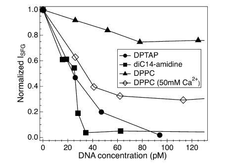 圖2。VSF光譜是OD拉伸區(qū)2100-2700 cm-1和CH拉伸區(qū)2850-2975 cm-1的DNA濃度的函數(shù)。陽離子脂質(zhì)單分子膜的脂質(zhì)密度為52?2/分子,兩性離子脂質(zhì)單分子膜的脂質(zhì)密度為47?2/分子。A組為DPTAP單層下的VSF光譜,B組為diC14氨基單層下的VSF光譜,C組為DPPC單層下的VSF光譜,D組為含有額外50 mM CaCl2的DPPC單層下的VSF光譜。所有實驗中的亞相都是磷酸鹽緩沖的。每個面板中的單個光譜是具有不同濃度λ-DNA噬菌體的相同系統(tǒng)。每個面板中都顯示了該頻率窗口的磷酸鹽緩沖D2O光譜,以供比較。實體曲線使用公式1擬合數(shù)據(jù)。