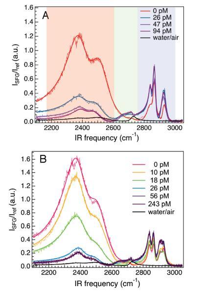 界面水的光譜響應(yīng)。圖2顯示了在2100-3100 cm-1范圍內(nèi),隨著亞相DNA濃度的增加,DPTAP、diC14氨基和DPPC單分子膜的VSF光譜。對這些數(shù)據(jù)的粗略檢查顯示出幾個特征。聚焦于圖2面板A,從低頻向高頻移動,很明顯,有一個巨大的雙峰結(jié)構(gòu),隨著DNA的加入,其振幅突然降低(透明的紅色矩形);一個小的、更高頻率的峰值(以≈2675 cm-1),隨著DNA(透明綠色矩形)的加入而增加;在2800-2950 cm-1的頻率范圍內(nèi)有幾個較窄的峰值(這些峰值是CH拉伸振動的結(jié)果,顯示在一個透明的藍色矩形中,下面將進一步討論)。