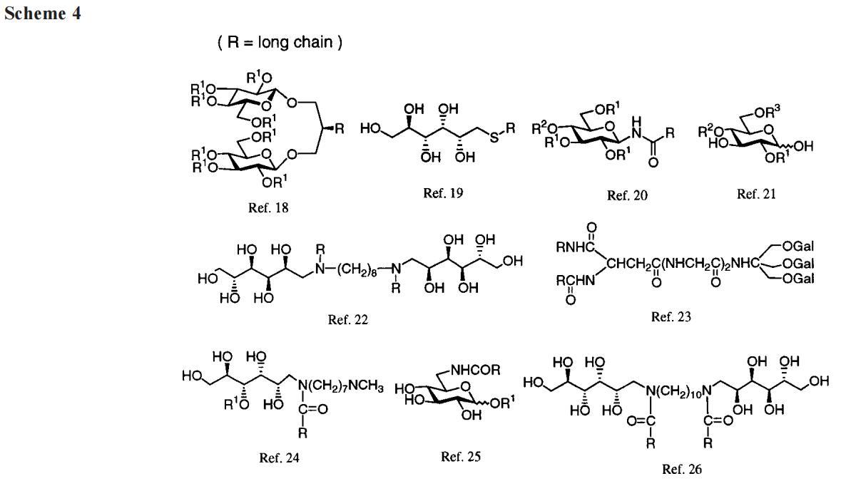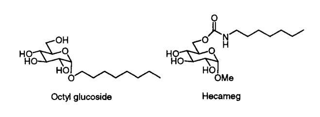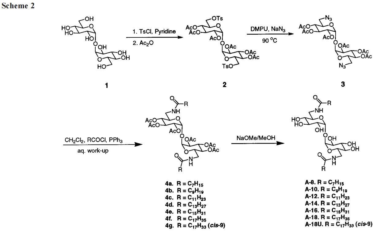 我們的第一個驚喜是發(fā)現(xiàn)A系列海藻糖雙子座不溶于水。例如,A-12、A-14和A-16(指鏈長的數(shù)字)在1毫升溫水中旋轉(zhuǎn)2毫克時會留下沉淀物。即使在70°C的溫度下,A-10也會在這種處理過程中形成渾濁的懸浮液。A-8在室溫下的可溶濃度僅為1-2 mM(根據(jù)動態(tài)光散射,在該濃度下,會形成膠束大小的聚集體)。天真地說,人們可能會認(rèn)為a-8的溶解度大得多,因?yàn)樵摲肿佑闪鶄€羥基和兩個酰胺組成。盡管相關(guān)的6-氨基-6-脫氧己糖衍生物需要加熱才能溶解,25許多烷基化單糖(例如,辛基葡萄糖苷和甲基6-O-(N-庚基羰基)-R-D-吡喃葡萄糖苷或下面的“Hecameg”)是水溶性的。然而,A-8并沒有類似的天賦。這里的教訓(xùn)是,用一句老生常談的話來說,我們的雙子座比其各個部分的總和要多(或少)。不管老生常談與否,雙子座的獨(dú)特屬性都取決于它。