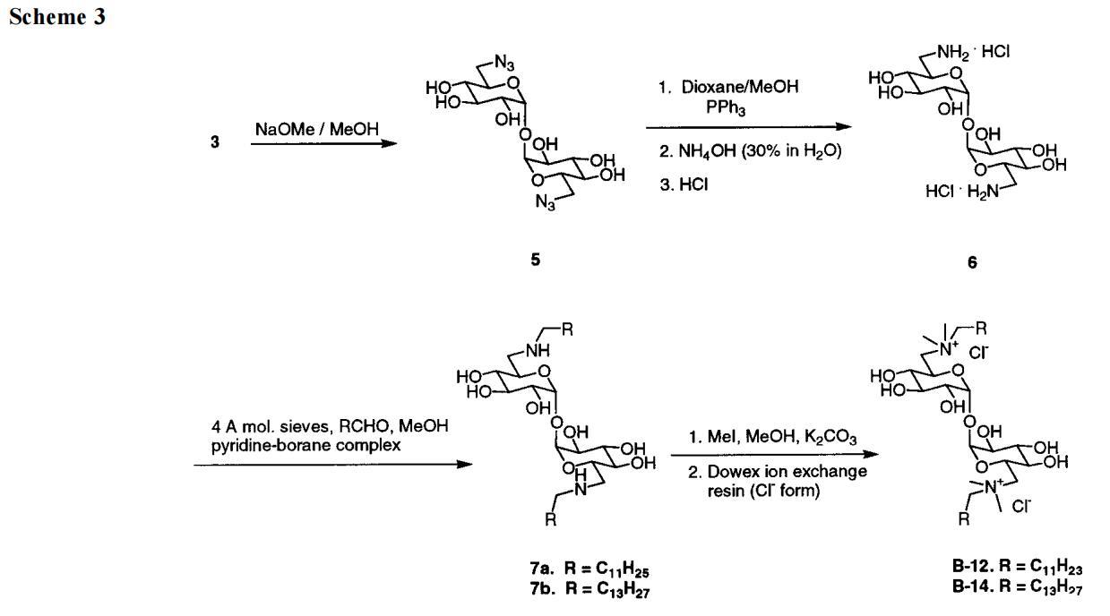 方案2和方案3以及實(shí)驗(yàn)部分詳述了我們獲得A系列和B系列海藻糖雙子的方法。另外幾條評論有助于美化這一信息。B型海藻糖雙子最明顯的先驗(yàn)途徑是用長鏈?zhǔn)灏分苯尤〈?的甲苯磺?;鶊F(tuán)。盡管沿著這些路線進(jìn)行了多次嘗試,但只獲得了分解產(chǎn)物或起始材料。然而,如方案2所示,我們成功地用疊氮化合物取代了2的兩個甲苯磺?;?,得到了3。此處采用文獻(xiàn)程序28,但出于安全考慮,HMPA被DMPU取代作為溶劑。然后,雙疊氮化物3經(jīng)過Staudinger反應(yīng)25,29,在一個步驟中得到長鏈雙酰胺4a-g,而該長鏈雙酰胺4a-g只需脫保護(hù)即可獲得a系列雙子。在方案3中,脫保護(hù)糖5的疊氮化物還原將化合物轉(zhuǎn)化為二伯胺鹽酸鹽6。長鏈醛與6和吡啶硼烷絡(luò)合物30的還原胺化得到海藻糖衍生物7。使用NaBH3-CN作為還原劑,該反應(yīng)的產(chǎn)率很低。在用甲基碘化物將7甲基化,然后進(jìn)行離子交換(以促進(jìn)純化和提高溶解性)之后,我們得到了B系列海藻糖雙子。