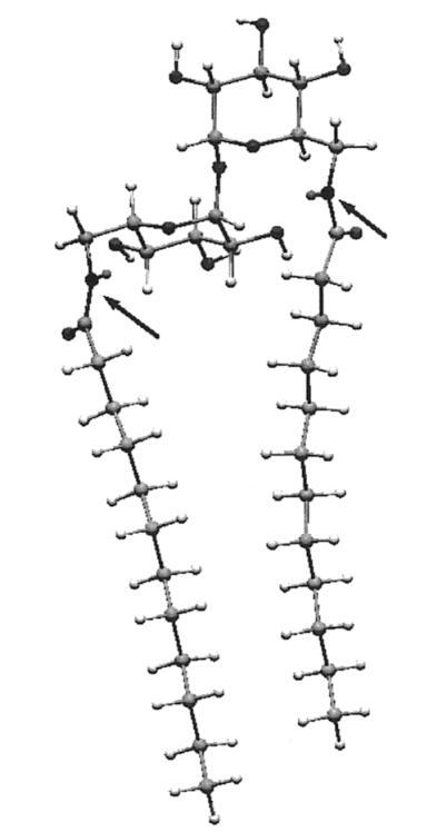 計算首先將海藻糖插入宏模型程序42,并對結(jié)構(gòu)進(jìn)行琥珀色能量最小化。從使用琥珀色*力場的25000個構(gòu)象搜索中,我們選擇了能量最低的構(gòu)象,該構(gòu)象恰好與報告的X射線結(jié)構(gòu)重疊。43,44接下來,該結(jié)構(gòu)中的6-和6′-羥基被乙酰氨基取代。在模擬的水環(huán)境中,用AMBER*再次進(jìn)行了25000次構(gòu)象搜索。然后乙?;皇榛〈缓髮ι傻腶-12雙子座進(jìn)行了另一次搜索。結(jié)果表明,整個構(gòu)象由酰胺羰基和相鄰葡萄糖環(huán)的2-羥基之間的兩個分子內(nèi)氫鍵控制。氫鍵導(dǎo)致兩條全反式鏈彼此擺動約95°。A-12的固態(tài)紅外光譜證實(shí)了這種相互作用,該光譜顯示1646 cm-1處有羰基帶,而Hecameg的羰基帶為1700 cm-1,單體葡萄糖類似物的羰基帶為1698 cm-1。25由于這種構(gòu)象會不切實(shí)際地排除分子內(nèi)疏水締合,而且在任何情況下,羰基氫鍵位點(diǎn)的溶劑可能會淹沒在水中,我們故意不允許-CdO氫鍵,并重新計算。通過這種方式,我們得到了圖6。可以看到,一條鏈上大約有八個碳與其伙伴鏈的碳并排排列。N/N距離僅為7.4?,整體分子形狀為“管狀”。用另一種方式說,糖的頭基延伸的距離不比兩條鏈的寬度大多少,就像人們預(yù)期的一種易于堆積成雙層的化合物那樣。45因此,正如前面從實(shí)驗(yàn)數(shù)據(jù)得出的結(jié)論,海藻糖更像是一個統(tǒng)一的頭基,而不是一個可以有效隔離鏈的長間隔基。