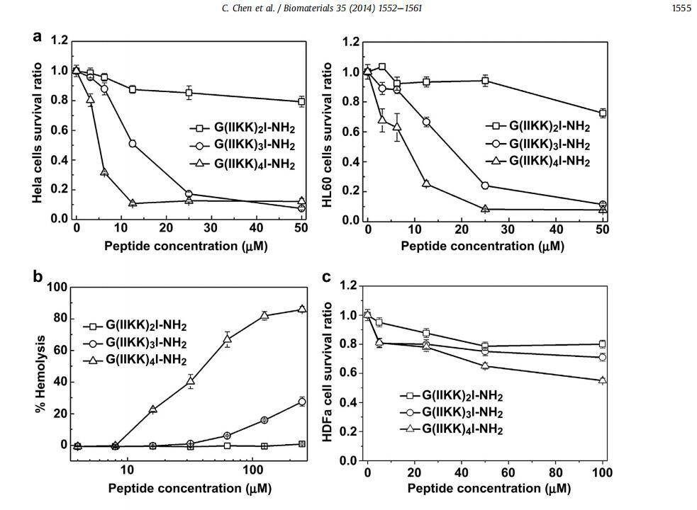 按照濃度依賴性模式,重復(fù)次數(shù)較多或長度較長的肽在殺死癌細(xì)胞(HeLa和HL60細(xì)胞)方面更有效,但對(duì)正常細(xì)胞(紅細(xì)胞和HDFa細(xì)胞)的體外毒性也開始增加,如圖1aec所示??偟膩碚f,就體外抗癌活性和細(xì)胞選擇性而言,G(IIKK)3I-NH2是最佳序列,其對(duì)HeLa和HL60細(xì)胞的IC50值為15和25 mM,EC50遠(yuǎn)大于250 mM(IC50:濃度導(dǎo)致50%的癌細(xì)胞生長抑制;EC50:濃度誘導(dǎo)50%的紅細(xì)胞溶解)。重要的是,HDFa細(xì)胞對(duì)這些肽有良好的耐受性,例如,在濃度低于50 mM時(shí),G(IIKK)3I-NH2對(duì)HDFa細(xì)胞的影響微不足道(圖1c)。我們合理設(shè)計(jì)的短肽的這種性能明顯優(yōu)于天然AMP,如馬蓋寧和蜂毒素,并且在有效性、選擇性甚至耐藥性方面也優(yōu)于抗癌藥物順鉑[12e15]。例如,在類似的實(shí)驗(yàn)條件下,magainin-2對(duì)HeLa細(xì)胞的IC50低于60 mM,而蜂毒肽在5 mM下的EC50則低得多,顯示出對(duì)宿主細(xì)胞的高毒性[12e14]。