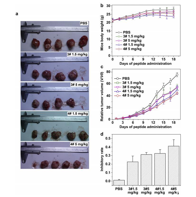 將人宮頸癌HeLa細(xì)胞接種于裸鼠皮下。腫瘤植入5天后,分別以1.5 mg/kg和5 mg/kg的劑量腹腔注射肽G(IIKK)3INH2和G(IIKK)4I-NH2。在給藥期間,未觀察到任何毒性跡象,如體重減輕和外觀不良(圖6b),盡管G(IIKK)4I-NH2顯示出更高的體外溶血性。與PBS中的陰性對(duì)照相比,這兩種肽對(duì)腫瘤生長表現(xiàn)出明顯的抑制作用,其中G(IIKK)4I-NH2表現(xiàn)出比G(IIKK)3I-NH2更好的療效(圖6c),這與它們的體外抗腫瘤趨勢一致。18天后,解剖腫瘤并稱重(圖6a和d)。在1.5 mg/kg和5 mg/kg劑量下,G(IIKK)3I-NH2治療組的腫瘤生長抑制率分別為0.23和0.31。G(IIKK)4I-NH2能產(chǎn)生更有效的抑制作用,在1.5 mg/kg和5 mg/kg劑量下,抑制率分別為0.32和0.41。這些數(shù)據(jù)表明,在小鼠異種移植模型中,螺旋肽可以有效地抑制腫瘤生長,而腫瘤細(xì)胞不能被完全清除。許多抗腫瘤藥物的不完全抑制作用已被廣泛觀察到,這可歸因于多種機(jī)制,例如藥物從腫瘤部位相對(duì)較快地清除,以及它們難以通過壞死區(qū)域擴(kuò)散[42],但目前這組肽背后的確切原因有待進(jìn)一步的機(jī)理研究。