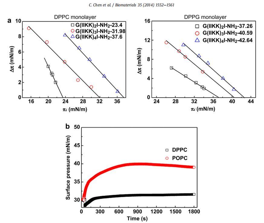 圖2。肽與不同脂質(zhì)單層的相互作用。(a)當(dāng)肽以3 mM濃度注入亞相時(shí),在不同初始表面壓力(pi)下,DPPC和DPPG單分子膜的表面壓力增加(Dp)。(b)將G(IIKK)3I-NH2注入DPPC和POPC單分子膜的亞相后的表面壓力與時(shí)間的關(guān)系。