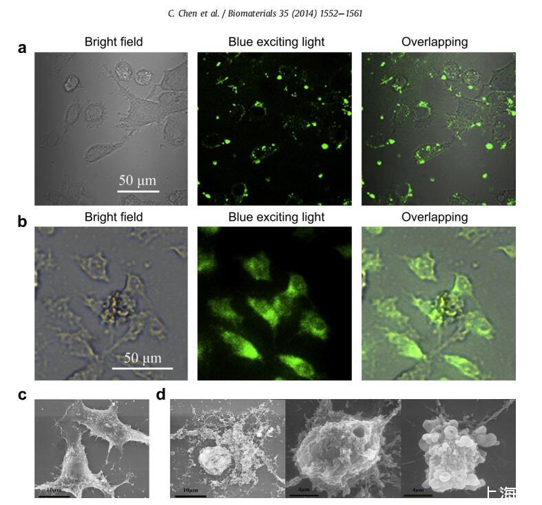 圖3。肽的原位定位和質(zhì)膜完整性。(a)用10mM FITC-G(IIKK)3I-NH2孵育1h后HeLa細(xì)胞中的肽位置。(b)用10mM FITC-G(IIKK)3I-NH2孵育24h后HeLa細(xì)胞中的肽位置。(c)未經(jīng)處理的HeLa細(xì)胞的代表性SEM顯微照片。(d)用10mM G(IIKK)3I-NH2處理24小時(shí)的HeLa細(xì)胞的代表性SEM顯微照片。