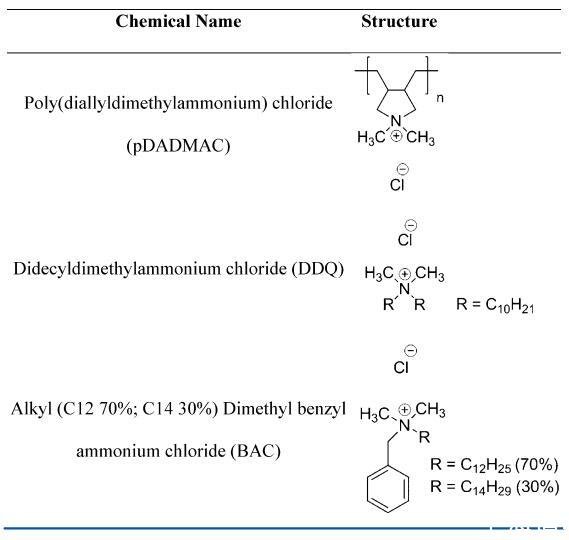 試劑和樣品制備。pDADMAC,Mv=8.5 kDa,作為28 wt%的水溶液從Poly Sciences Inc.獲得,pDADMAC,Mv=21和140 kDa,分別作為35和20 wt%的溶液從Sigmaldrich獲得。DDQ從Lonza(商品名-Lonza Bardac 2240)獲得,并以40 wt%的水溶液形式收到。BAC從Thor(商品名-Activide BAC 50 M)獲得,并以50 wt%的水溶液形式接收。通過在80°C的真空烘箱中干燥,通過重量法驗(yàn)證上述儲(chǔ)備溶液的濃度,直到未記錄進(jìn)一步的質(zhì)量損失。每個(gè)樣品進(jìn)行三次重復(fù)測(cè)量,并記錄平均結(jié)果。除非另有說明,否則表面活性劑和聚電解質(zhì)均按原樣使用,無需進(jìn)一步純化(表1)。
