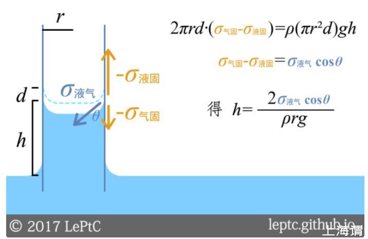 講到這里,我們已經(jīng)有三種方法來解釋這個(gè)現(xiàn)象了:①水想增加自己跟玻璃管內(nèi)壁的接觸面積,直到表面能的消耗不足以補(bǔ)償重力勢能;②固液接觸面的負(fù)張力把液體向上拉;③凹液面會降低液體內(nèi)的壓強(qiáng),從而外部氣壓把液體壓上來。三種方法都能推導(dǎo)出相同的結(jié)論,下圖中給出了第一種推法。
