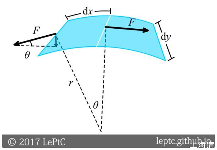 假設(shè)膜在x的方向彎曲,曲率半徑為r,作用在一個(gè)微小的長度dy上的表面張力F=σdy,sinθ≈dx/r,指向球內(nèi)的合力為Fsinθ=σdxdy/r(沒有乘2是因?yàn)槊織l邊的力被相鄰兩個(gè)面元共用),這一力由壓強(qiáng)差平衡,除以面積dxdy得壓強(qiáng)差為σ/r。對于球面x和y方向都彎,故球內(nèi)壓強(qiáng)比球外大2σ/r(對于肥皂泡因?yàn)橛袃蓪咏缑孢€要再乘2)。