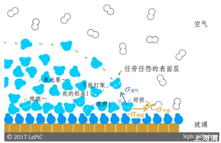 在氣體和液體之外,現(xiàn)在我們再加入新的角色——固體表面。玻璃的表面對水分子非常有吸引力(雖然玻璃的主要成分是二氧化硅,但它的表面通常會因?yàn)閮r(jià)態(tài)不飽和而結(jié)合很多羥基)。如果水滴碰到的界面是玻璃,就會出現(xiàn)跟空氣相反的情況:接觸面的水分子比平衡時(shí)更擠,表面張力是擴(kuò)張的,表面能是負(fù)的,整坨水滴會希望自己跟玻璃的接觸面積越大越好(同時(shí)跟空氣接觸面積越小越好),形成特定的接觸角θ。這個(gè)角越小,意味著固體表面的親水性越強(qiáng)。