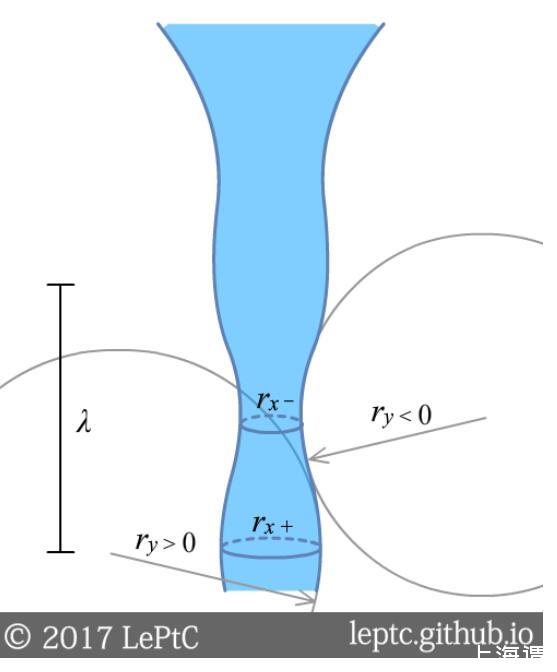 這一現(xiàn)象稱為普拉托-瑞利不穩(wěn)定性(Plateau–Rayleigh instability)。我們在柱狀界面上加一個(gè)波長為λ的擾動,橫截面上的曲率變化rx是促進(jìn)柱的分裂的,但縱截面上ry的曲率變化會阻礙分裂,后者的效應(yīng)隨λ變長而減弱。