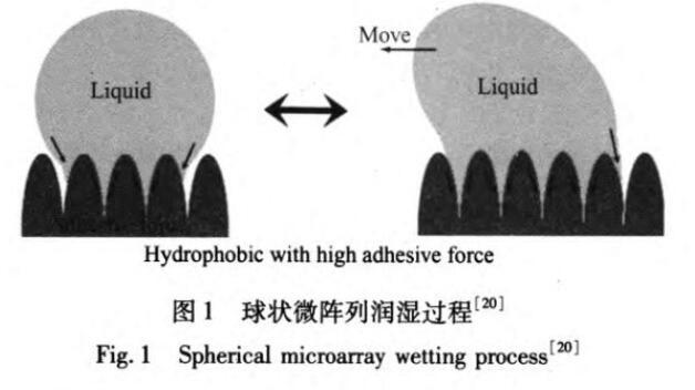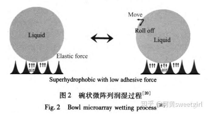 有評論說疏水高粘附的界面也會存在,然而這是具有特殊微納米結(jié)構(gòu)的表面,比如玫瑰花瓣等,這類的界面對微結(jié)構(gòu)的幾何性質(zhì)要求較高。而通常的情形下,微納米結(jié)構(gòu)的存在會使疏水的界面出現(xiàn)超疏水的現(xiàn)象,其粘附力會更低,比如荷葉的表面。如下圖中,上面的是疏水高粘附,下面是疏水低粘附的界面,然而這時由水與界面的接觸面積決定的,接觸面積越大,其粘附力越大,否則會越小。這是在化學(xué)性質(zhì)相同時,從微結(jié)構(gòu)的角度考慮的粘附力。這種疏水高粘附是與平整的高粘附界面相互比較來說的,然而其是否一定比親水的物質(zhì)粘附力大未曾可知。
