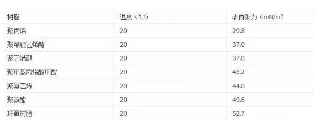 由于高分子沒有氣態(tài),即樹脂氣相的蒸氣壓為零。因此,與液態(tài)樹脂共存的只有氣相。固體樹脂表面張力的測定有很大的困難,因此,固體的表面張力一般是通過間接方法進(jìn)行測定的,對于涂層而可以先測定樹脂熔體的表面張力,再根據(jù)表面張力與溫度的關(guān)系進(jìn)行外推。表1列出了一些樹脂從液態(tài)外推至固體時的表面張力值。