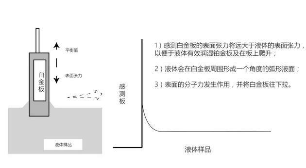 當(dāng)感測到鉑金板浸入到被測液體后,鉑金板周圍就會受到表面張力的作用,液體的表面張力會將鉑金盡量的往下拉。當(dāng)液體表面張力及其他相關(guān)的力與平衡力達到均衡時,感測鉑金板就會停止向液體內(nèi)部浸入。這時候,儀器的平衡感應(yīng)器就會測量浸入深度,并將它轉(zhuǎn)化為液體的表面張力值。