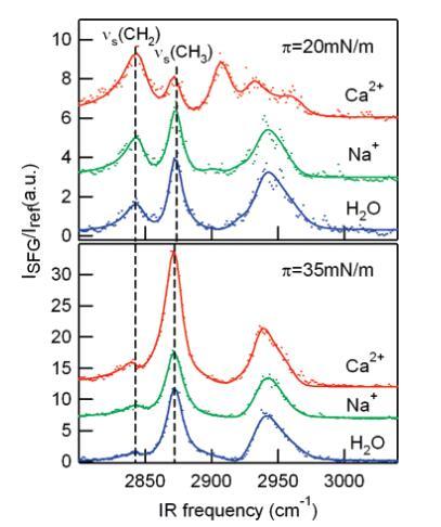 振動(dòng)和頻發(fā)生光譜學(xué)(VSFG)。VSFG是一種非線性振動(dòng)光譜技術(shù),可提供界面分子構(gòu)象順序和方向的表面特定信息,進(jìn)一步研究了在Ca2+存在下這種改變相行為的分子起源。21,22為了量化離子對脂質(zhì)尾部構(gòu)象的影響,在C-H拉伸區(qū)域收集VSFG光譜。沿等溫線測量了幾個(gè)表面壓力的光譜;圖5顯示了DPPC單層在20 mN/m和35 mN/m下三種不同亞相的光譜。可以觀察到五種振動(dòng)模式:以2876、2970和2938 cm-1為中心的峰值分別歸屬于CH3對稱拉伸、CH3反對稱拉伸和CH3費(fèi)米共振。22 CH2對稱和反對稱拉伸頻率約為2846和2920 cm-1。氘化DPPC脂質(zhì)單層(d62和d75 DPPC)上的VSFG實(shí)驗(yàn)顯示膽堿C-H伸展的信號非常低。