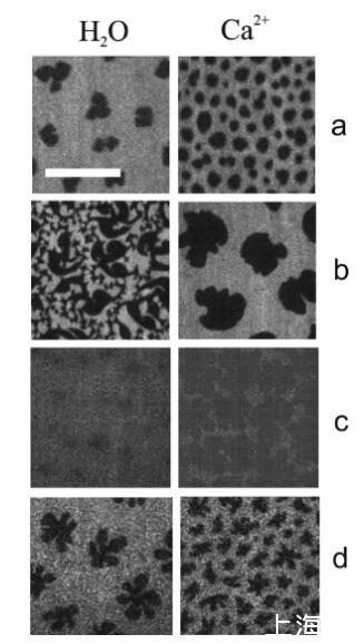 圖3:水上DPPC(a、b、c)和DMPS(d)單層的熒光圖像(左圖)和1 M CaCl2溶液(右圖),π)4 mN/M(a)、π)6.5 mN/M(b)、π)35 mN/M(c)和π)2 mN/M(d)。單分子膜用5 mol%羅丹明PE標(biāo)記:亮區(qū)對應(yīng)于LE相,暗區(qū)為LC結(jié)構(gòu)域。比例尺代表15μm。所有圖像的對比度都相同。