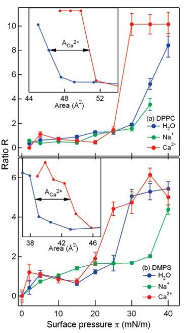 圖6:。作為DPPC(a)和DMPS(b)單分子膜表面壓力的函數(shù),CH3和CH2對稱拉伸振子強(qiáng)度的比值R:純水(藍(lán)色)、1 M NaCl溶液(綠色)和1 M CaCl2溶液(紅色)。由于單分子膜的崩塌,在π)40 mN/m時(shí),無法測定Na+-DPPC的比值R。由于壓縮單層膜的νsCH2振幅的不確定性,在較高壓力下,誤差條較大。插圖顯示了作為每種脂質(zhì)面積函數(shù)顯示的比率R。請注意~4?2/脂質(zhì)置換(解釋為Ca2+足跡),與圖2中的等溫線一致。
