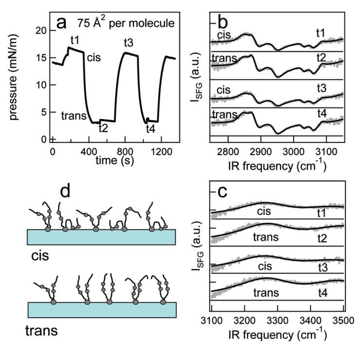 圖4:(a)在每分子75?2的面積處,脂質(zhì)/H2O界面處的光開關脂質(zhì)的表面壓力作為時間的函數(shù)。370和450 nm光照射~100秒分別產(chǎn)生cis(高壓)和trans(低壓)狀態(tài)。壓力的微小劇烈波動是由于樣品高度的變化,以校正水的蒸發(fā)。(b和c)CH和OH區(qū)域(灰色)中相應的VSFG光譜,以及洛倫茲線形狀模型的擬合(見正文)。為了清晰起見,對光譜進行了偏移。t1至t4對應于面板a中進行光譜測量的時間。(d)脂質(zhì)尾部方向示意圖。光開關脂質(zhì)的偶氮苯部分用灰色圓圈表示。
