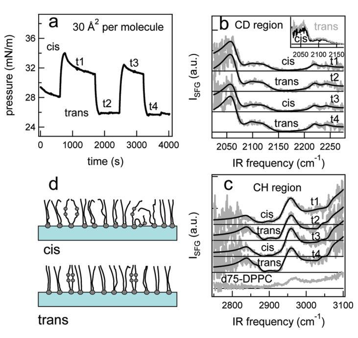圖7:。結(jié)果:對于1:5的DT Azo-5P/d75 DPPC混合物,在脂質(zhì)/水界面上,每個分子的面積為30?2。(a)表面壓力與時間的關系。370和450 nm光照射~100秒分別產(chǎn)生cis(高壓)和trans(低壓)狀態(tài)。壓力的微小劇烈波動是由于樣品高度的變化,以校正水的蒸發(fā)。順式狀態(tài)下表面壓力的降低可能是由于單層的松弛或膠束或囊泡的形成減少了表面的脂質(zhì)量。(b)相應的VSFG光譜(灰色)以及CD區(qū)域的擬合。為了清晰起見,對光譜進行了偏移。插圖顯示了相互重疊的反式和順式光譜,以強調(diào)差異。(c)VSFG光譜(灰色)與fits一起引導眼睛進入CH區(qū)域。底部曲線顯示了P下純d75 DPPC的光譜~40 mN/m.(d)脂尾方向示意圖。光開關脂質(zhì)的偶氮苯部分用灰色圓圈表示。