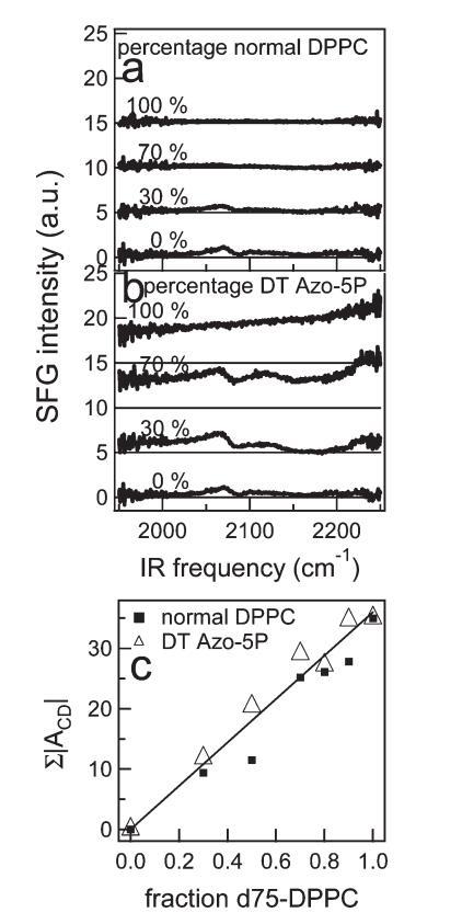 為了證明外差效應是信號增強的原因,我們測量了DPPC和DT-Azo-5P混合物的VSFG光譜。為了獲得分子特異性,我們在本實驗中使用了d75 DPPC,并檢查了CD振動區(qū)。作為參考樣品,我們使用正常DPPC(未稀釋)和d75 DPPC的混合物。換句話說,我們比較了d75 DPPC和DT Azo-5P的不同混合物與d75 DPPC和DPPC的混合物(未稀釋)。摩爾d75 DPPC/DT偶氮-5P比等于摩爾d75 DPPC/DPPC(未稀釋)比。我們總是以相同的方式制備單層,這樣每個分子的面積~35?2(凝聚相)。對于混合物中存在的DPPC或DT Azo-5P的不同部分,d75 DPPC產(chǎn)生的VSFG光譜如圖9 a和b部分所示。正如預期的那樣,對于d75 DPPC/DPPC(未稀釋)混合物(圖9a),VSFG信號隨著層中正常DPPC分數(shù)的增加而大致呈二次方減小。在這種情況下,非共振項很小,因此信號由方程1最后一行中的最后一項控制(ISFGχ*R(2)χR(2)IVISIIR)。對于含DT Azo-5P的混合物,效果截然不同。背景隨著DT Azo-5P量的增加而增加,背景頂部的信號大小大致不變,盡管d75 DPPC量從下到上減少。通過用上述模型擬合數(shù)據(jù),我們可以提取信號的非共振和共振貢獻。共振貢獻,作為CD振幅之和,如圖9c所示,作為混合物中存在的分數(shù)d75 DPPC的函數(shù)。顯然,對于這兩個樣本,振幅隨著d75 DPPC的分數(shù)呈線性增加,并且兩條曲線相互重疊。因此,具有強NR信號的分子的存在僅影響非共振部分,但有趣的是,它放大了相鄰分子的信號。