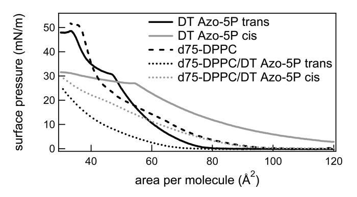 圖2:反式和順式狀態(tài)下的光開關脂質(zhì)DT Azo-5P的表面壓力與面積等溫線(實線),d75-DPPC的表面壓力與面積等溫線(虛線),以及光開關兩種狀態(tài)下的1:5摩爾比的光開關脂質(zhì)與d75 DPPC的表面壓力與面積等溫線(虛線)。