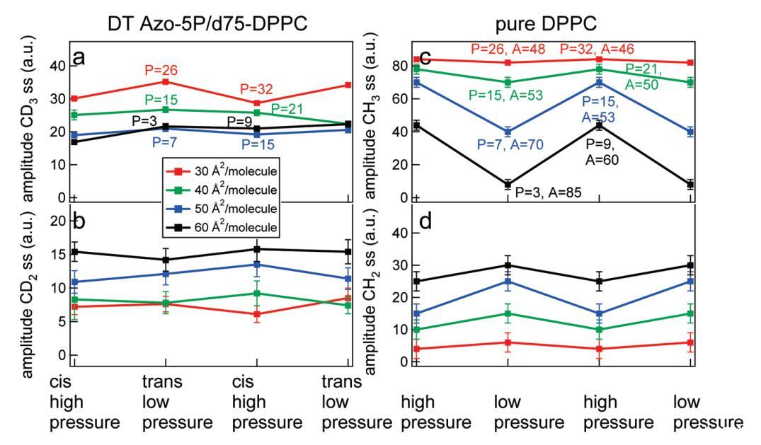 對于脂質(zhì)混合物,光開關狀態(tài)的影響明顯表現(xiàn)在表面壓力的變化中,但DT偶氮-5P順式和反式狀態(tài)之間的分子水平差異不太明顯。然而,在高密度和高壓下,CD3和CD2拉伸模式的振幅表現(xiàn)出與直覺相反的行為。與高壓狀態(tài)相比,在低壓狀態(tài)下,傳輸狀態(tài)下,CD3模式的振幅更大,CD2模式的振幅更小。對于DPPC的純層,壓力越高,CH3對稱拉伸模式的信號越高,CH2模式的信號越低。顯然,光開關的存在以一種不同的方式影響DPPC脂質(zhì)尾部的結(jié)構(gòu),這僅僅是因為壓力的變化。