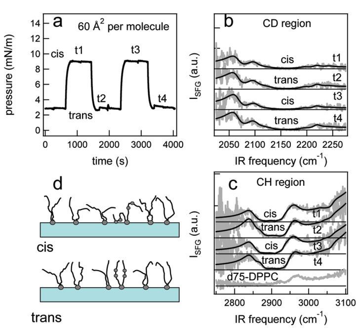 圖6:結(jié)果:DT Azo-5P/d75 DPPC的1:5混合物在脂質(zhì)/水界面上的面積為60?2/分子。(a)表面壓力與時間的關系。370和450 nm光照射~100秒分別產(chǎn)生cis(高壓)和trans(低壓)狀態(tài)。壓力的微小劇烈波動是由于樣品高度的變化,以校正水的蒸發(fā)。(b)相應的VSFG光譜(灰色)以及CD區(qū)域的擬合。為了清晰起見,對光譜進行了偏移。(c)VSFG光譜(灰色)與fits一起引導眼睛進入CH區(qū)域。底部曲線顯示了P下純d75 DPPC的光譜~40 mN/m.(d)脂尾方向示意圖。光開關脂質(zhì)的偶氮苯部分用灰色圓圈表示。