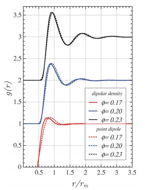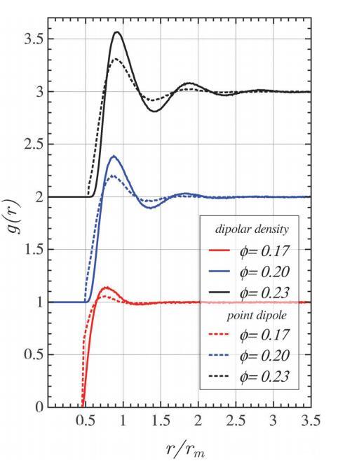 在第一個(gè)峰值位置和g(r)開(kāi)始偏離零的小區(qū)域觀(guān)察到輕微差異。當(dāng)系統(tǒng)更加結(jié)構(gòu)化時(shí),協(xié)議會(huì)得到改善。特別是,對(duì)于弱相互作用域,差異開(kāi)始明顯。這些偏差是由于點(diǎn)偶極力在接觸時(shí)趨于有限值,而在偶極密度情況下,它會(huì)發(fā)散。因此,硬盤(pán)相互作用與點(diǎn)偶極子模型有關(guān)。