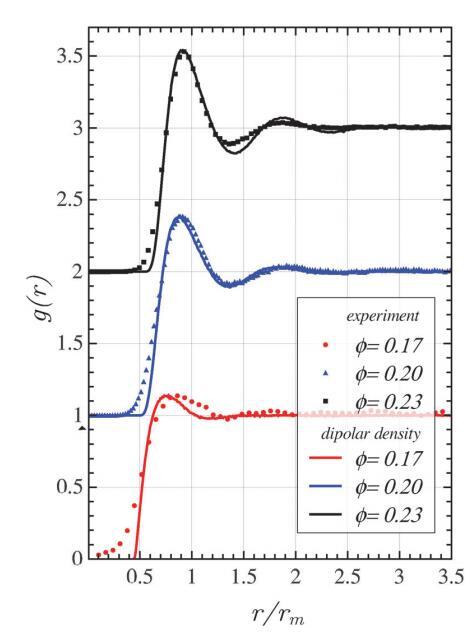 圖6顯示了實(shí)驗(yàn)g(r)與具有全偶極密度相互作用的BD模擬的比較,等式(4)。這里,為了方便起見(jiàn),通過(guò)平均幾何距離rm來(lái)縮放距離r。對(duì)于實(shí)驗(yàn)g(r),我們從最匹配BD g(r)峰值位置的90%置信區(qū)間中選擇rm值。總的來(lái)說(shuō),我們觀(guān)察到實(shí)驗(yàn)和模擬之間的顯著一致性。模擬結(jié)果高估了第一個(gè)最小深度,低估了第一個(gè)峰值寬度。這兩種差異可能歸因于多分散性效應(yīng),在我們的BD模擬中沒(méi)有考慮到。