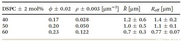 表1考慮的單分子膜的凝聚面積分?jǐn)?shù)、數(shù)密度、平均半徑和有效半徑。誤差由標(biāo)準(zhǔn)差確定,但f除外,f是通過(guò)改變閾值確定的,如實(shí)驗(yàn)部分所述