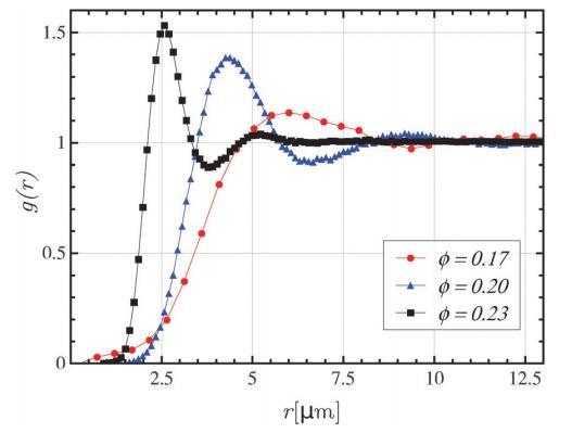 圖5顯示了三個(gè)實(shí)驗(yàn)系統(tǒng)的徑向分布函數(shù)。在所有情況下,g(r)類(lèi)似于液體,顯示出明確的第一峰(在rmax處),其表征了第一配位殼層,即最近鄰。此外,對(duì)于f=0.20和f=0.23的系統(tǒng),觀(guān)察到與第二配位殼對(duì)應(yīng)的標(biāo)記的第一最小值和第二最大值。由于“強(qiáng)”排斥作用,最近鄰距離遠(yuǎn)大于平均磁疇直徑。因此,硬核斥力不是結(jié)構(gòu)的決定因素,系統(tǒng)的特征長(zhǎng)度是平均幾何距離rm=r 1/2。