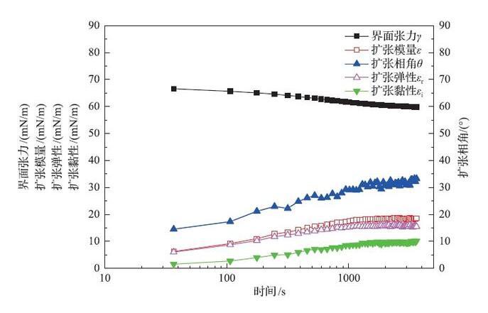 表面活性劑溶液的動(dòng)態(tài)界面張力、擴(kuò)張模量、擴(kuò)張相角、擴(kuò)張彈性和擴(kuò)張黏性隨時(shí)間變化曲線(xiàn)