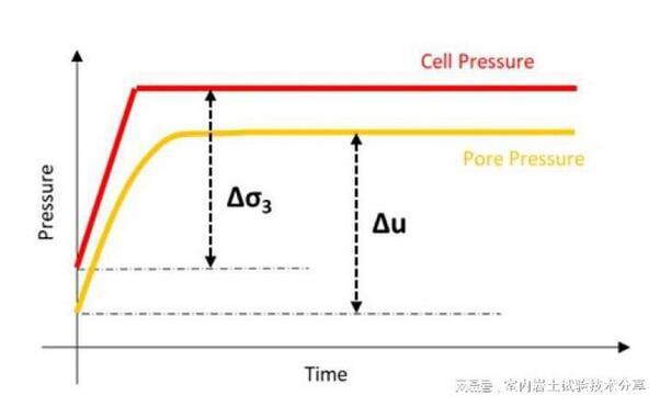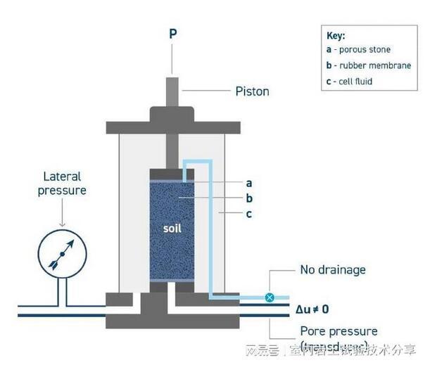 這里以有效應(yīng)力來衡量剪切強(qiáng)度。試樣飽和并允許在所需的約束壓力下進(jìn)行固結(jié)(土壤固結(jié)是改變其結(jié)構(gòu)和含水量的過程)。一旦固結(jié),試樣就被施加了一定的荷載,在此期間不允許排水,以便測量孔隙壓力。