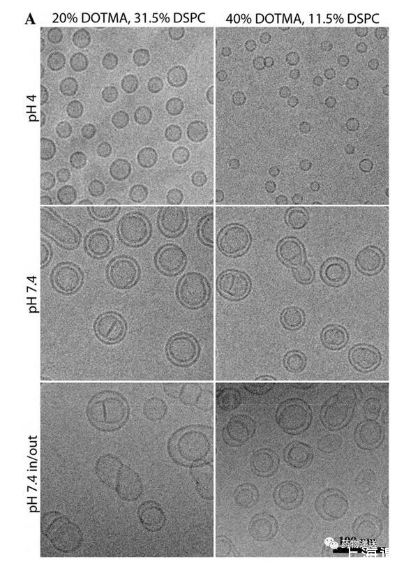 此外還發(fā)現(xiàn),采用乙醇稀釋/快速混合技術(shù)制備LNP-siRNA,當siRNA含量較高時,表現(xiàn)為堆疊的小雙層結(jié)構(gòu),其中siRNA被包載于緊密相連的脂質(zhì)雙分子層之間;當siRNA含量較低時,堆疊結(jié)構(gòu)的比例降低,LNP-siRNA復合物系統(tǒng)則表現(xiàn)出siRNA雙層結(jié)構(gòu)和非晶態(tài)電子致密核的組合,這可能是由中性形式的可電離陽離子脂質(zhì)產(chǎn)生的油滴而形成。所得結(jié)論為:含可電離陽離子脂質(zhì)的LNP體系在pH=4時形成雙層結(jié)構(gòu),在pH=7.4時形成非晶態(tài)“固體核”結(jié)構(gòu)。