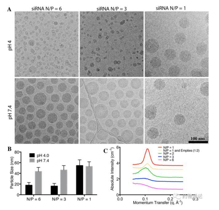使用帶電荷脂質(zhì)制備siRNA-LNP時,正電荷與負電荷的數(shù)量比會影響納米粒的大小、穩(wěn)定性、電位等性能。在siRNA-LNP中,正電荷通常為具有可電離銨根(N)的陽離子脂質(zhì),而負電荷則為帶有大量磷酸根(P)的核酸分子,兩者可通過靜電吸附的方式結(jié)合在一起。因此,不合理的比例可能會導致粒徑過大、穩(wěn)定性差等缺陷。值得一提的是,在研究中發(fā)現(xiàn),當N/P=1時,pH中和后LNP的粒徑不會有較大改變;當N/P=3或者6時,LNP在pH=7.4的緩沖液中粒徑會變大。而永久陽離子脂質(zhì)(例如DOTAP)制備的LNP在任何pH緩沖液中都不具有固體核心結(jié)構(gòu)。