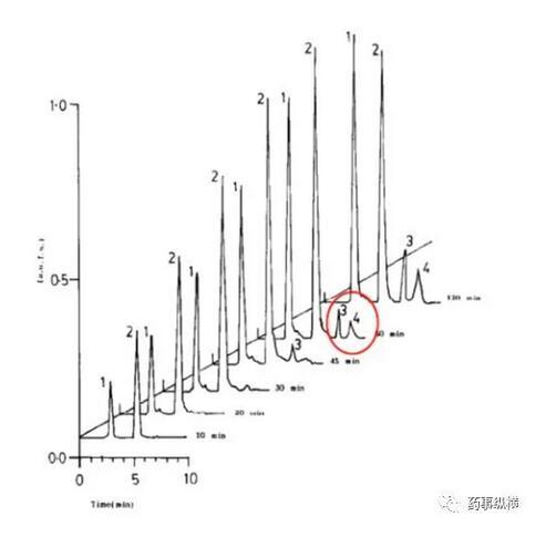 利福平在酸溶液中的降解情況(3、4為兩個(gè)降解物峰)