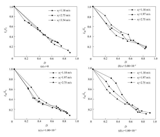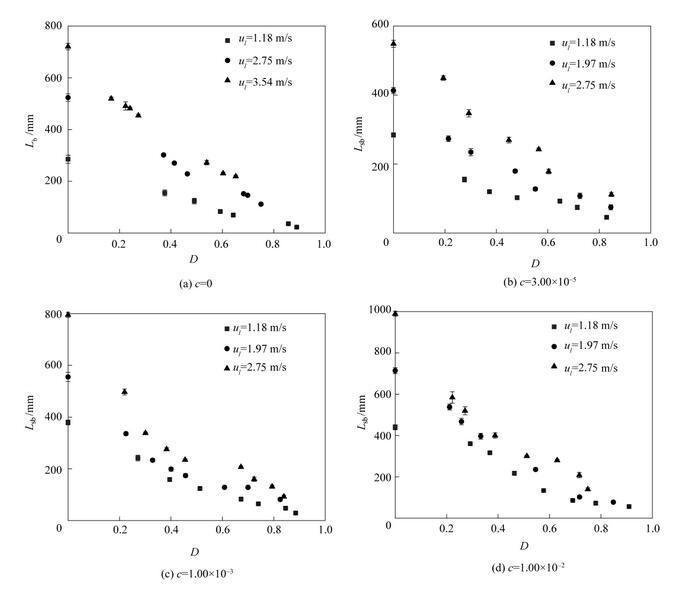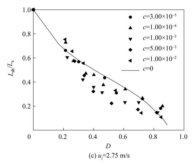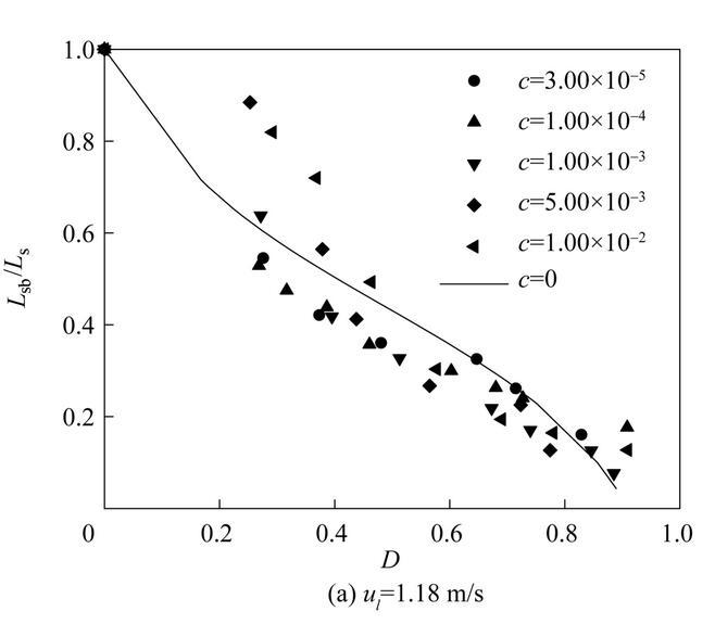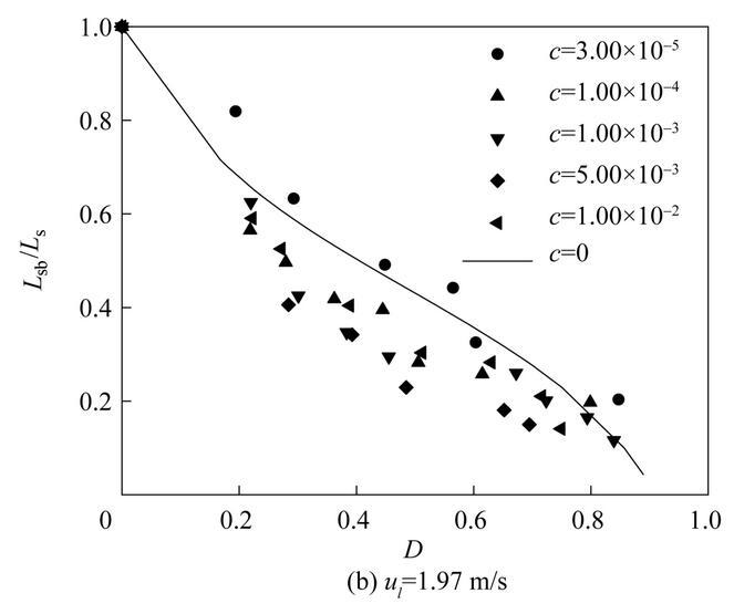 圖11是不同濃度表面活性劑射流破裂長(zhǎng)度L sb隨氣泡無(wú)量綱直徑D=d b/d 0(d b為氣泡直徑)的變化。從圖中可以看出,不同表面活性劑濃度下,射流破裂長(zhǎng)度隨氣泡無(wú)量綱直徑D的變化趨勢(shì)是相似的。射流破裂長(zhǎng)度隨著氣泡直徑的增大逐漸減小;當(dāng)氣泡直徑相同時(shí),提高液體射流速度會(huì)導(dǎo)致更大的射流破裂長(zhǎng)度。